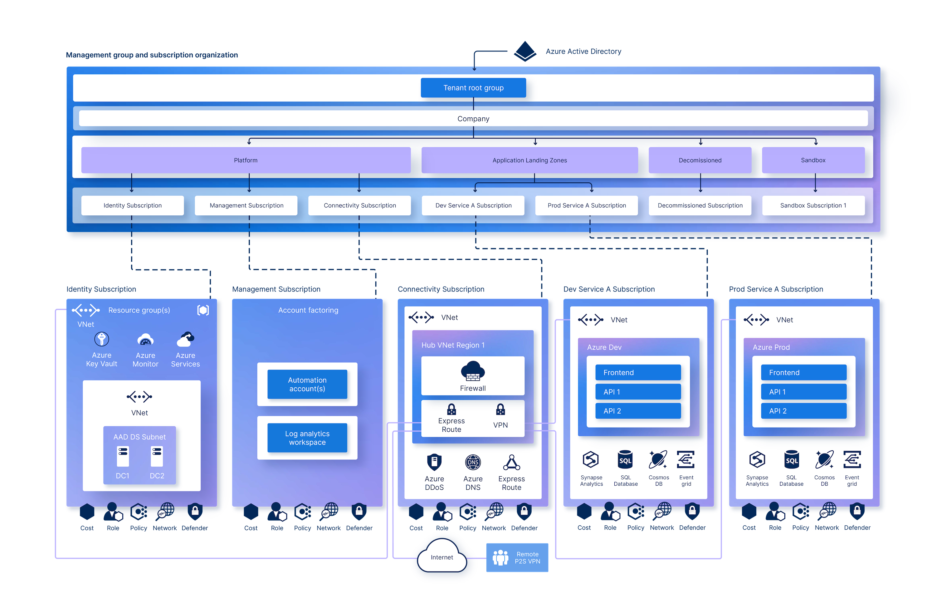 An Azure landing zone is made up of two fundamental pillars: Platform resources that are presented to workloads such as Policy, Internal DNS and Central Connectivity and Isolated Application Subscriptions for business data and workloads.